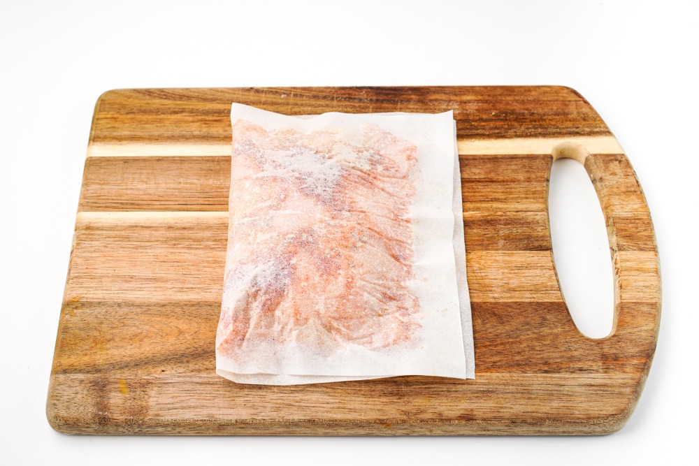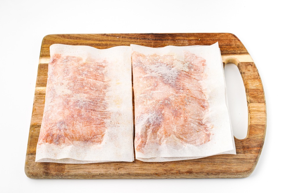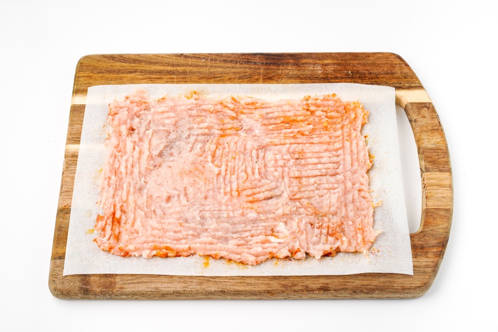 Выложить часть фарша на пергамент и равномерно распределить его тонким слоем, формируя прямоугольник, отступая от края 1 сантиметр. Стараться делать слой одинаковой толщины по всей поверхности пергамента.