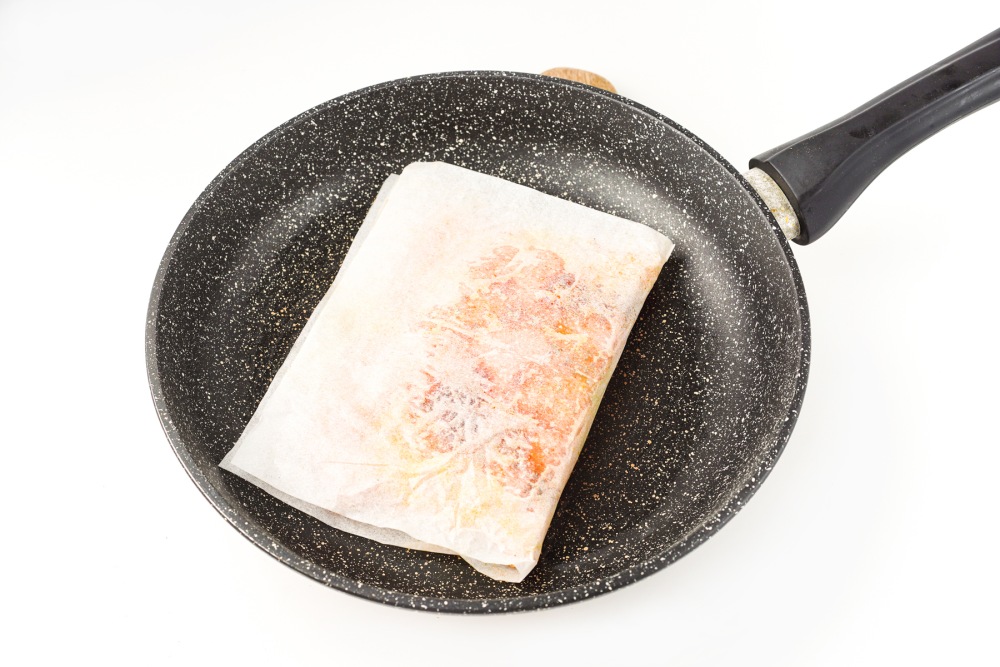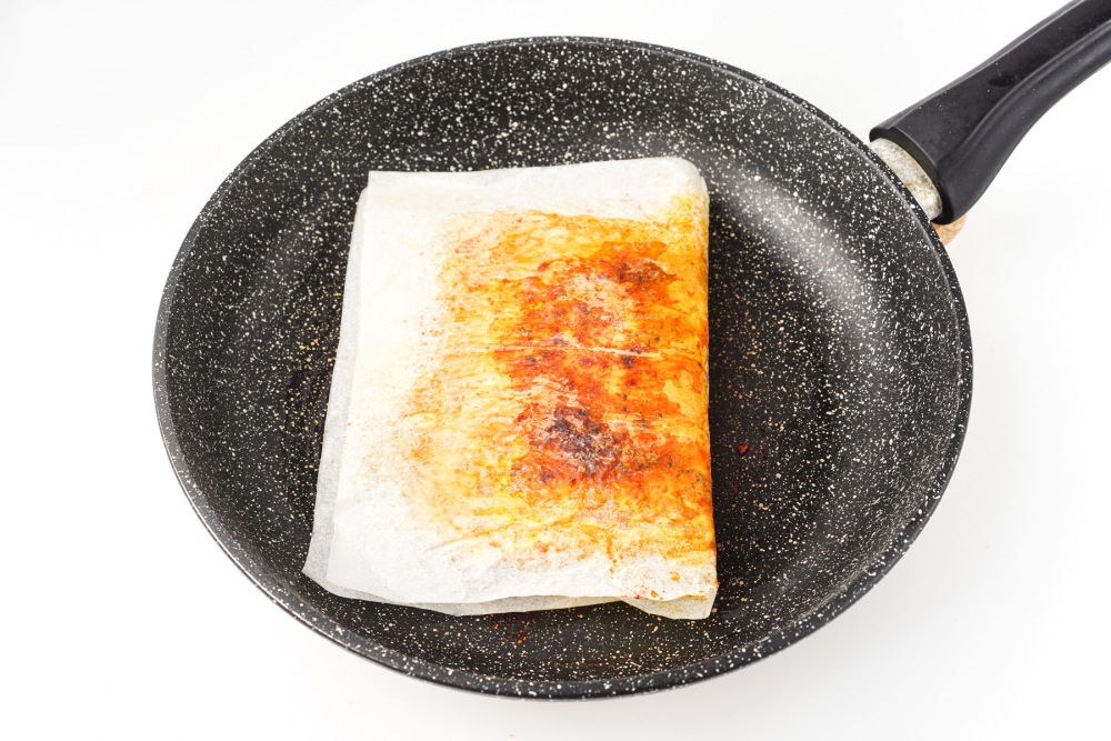 Хорошо прогреть сковороду, выложить лист заготовки и жарить 5-7 минут.