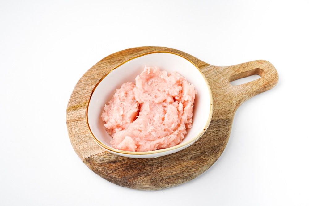 Нарезать филе на крупные куски, чтобы блендеру было проще его измельчать. Удалить плёнки и жилки, если они есть. Выложить куски филе в чашу блендера, посолить и измельчить до однородного фарша. Следить, чтобы масса получилась пластичной, без комочков.