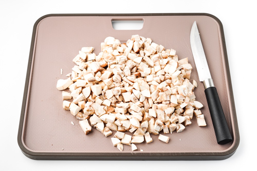 Промыть шампиньоны под проточной водой и обсушить. Нарезать небольшими кубиками, чтобы начинка была равномерной и удобно распределялась по фаршу.
