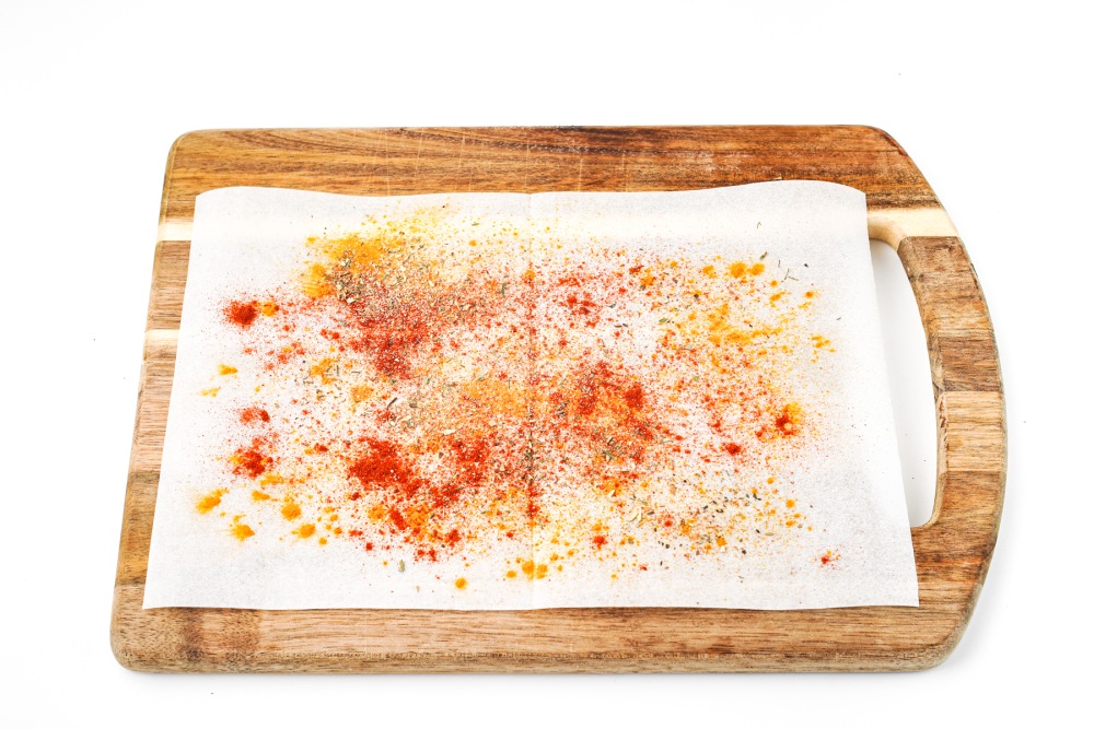 Нарезать пергамент на прямоугольные листы удобного размера. Смазать каждый лист тонким слоем масла и обильно посыпать специями, такими как куркума, паприка, сушеным укропом, чесноком.
