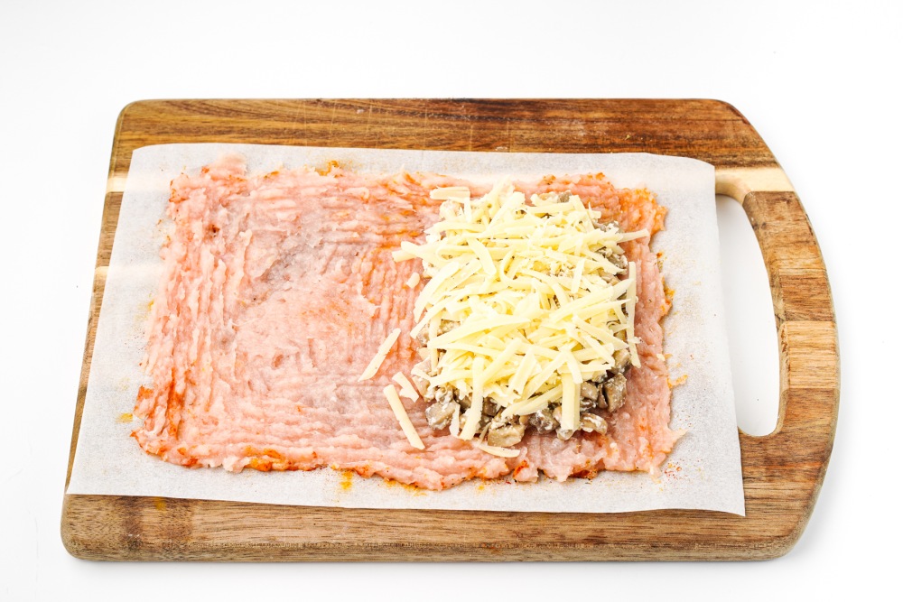 На одну половину фарша выложить грибную начинку, распределить ровным слоем отступая от краев примерно на 1 см. Сверху щедро посыпать тёртым сыром.