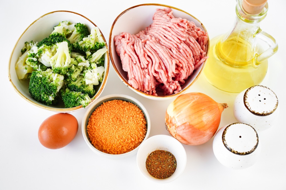 Подготовить ингредиенты для котлет из фарша индейки на сковороде. Достать фарш индейки из холодильника заранее, чтобы он стал комнатной температуры, так масса будет легче перемешиваться и жариться. Если используете замороженное брокколи, то его необходимо заранее достать из морозилки и дать оттаять.