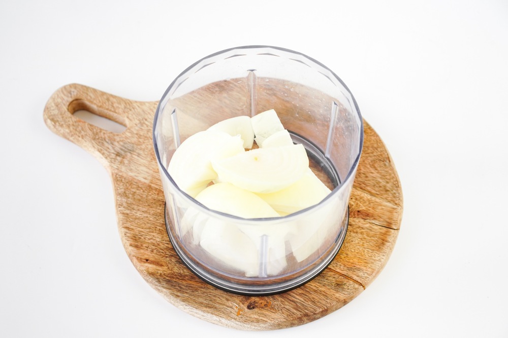 Включить блендер на максимальные обороты и довести лук до состояния однородного пюре. Именно луковое пюре, а не кусочки, сделает котлеты мягкими и сочными даже без добавления сливок или молока.