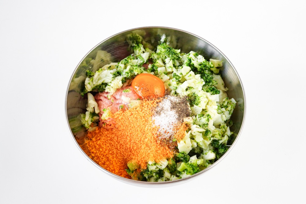 В глубокой миске соединить фарш индейки, луковое пюре, измельчённую брокколи, разбить одно яйцо, добавить панировочные сухари, специи, соль и чёрный перец по вкусу. Если фарш кажется слишком жидким, добавить еще немного сухарей.