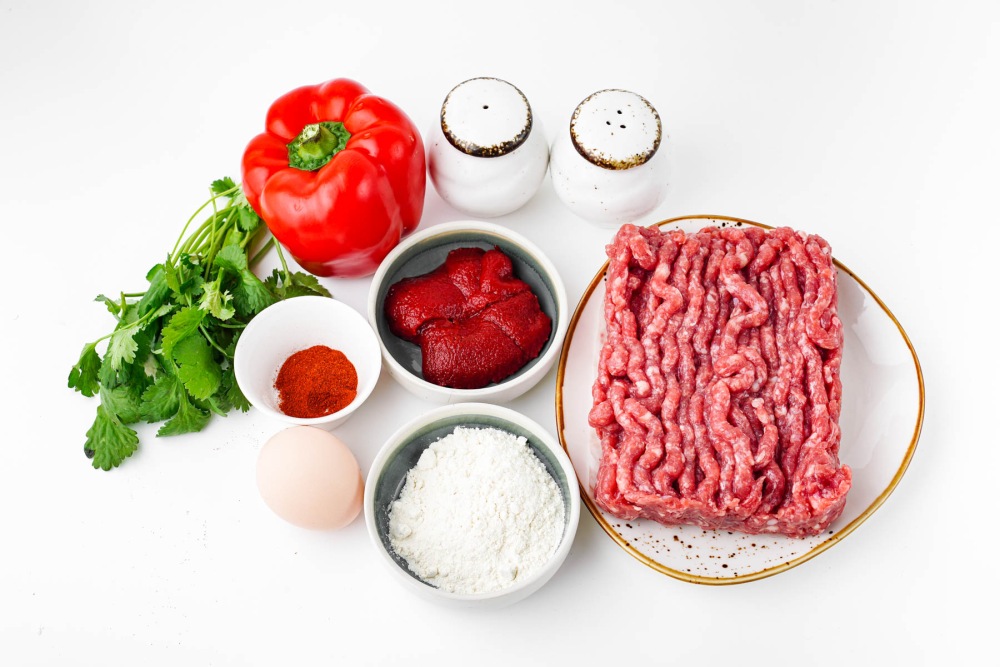 Достать фарш из холодильника заранее, чтобы он немного согрелся до комнатной температуры. Подготовить болгарский перец, кинзу, яйцо, томатную пасту, муку и специи. Проверить свежесть фарша - он должен иметь приятный мясной запах и равномерный цвет без потемнений.