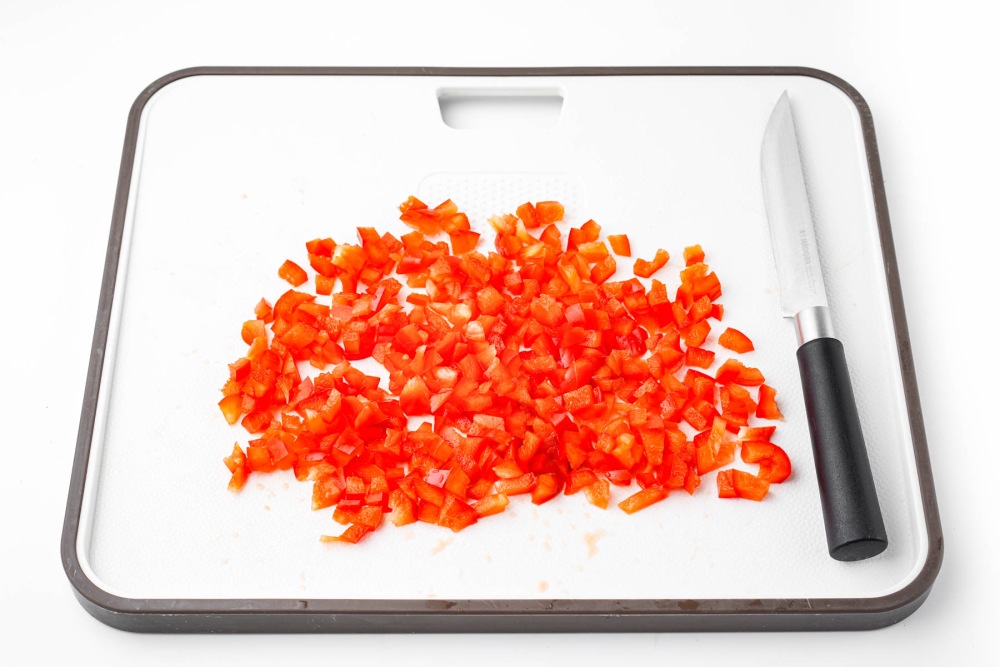 Промыть и нарезать мелким кубиком болгарский перец.