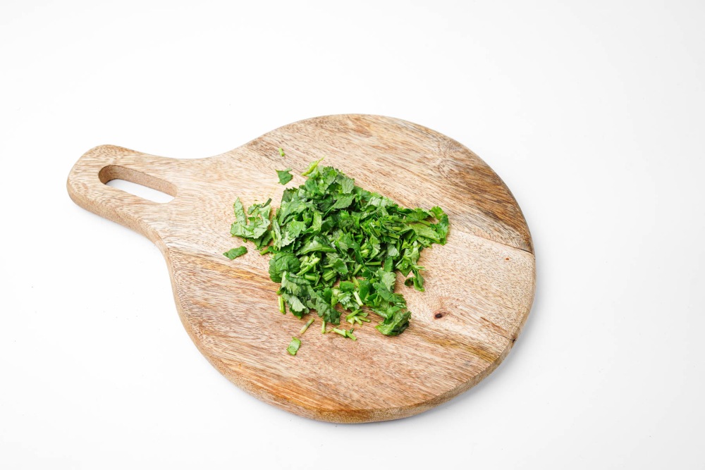 Промыть кинзу в холодной воде, аккуратно встряхнуть лишнюю влагу. Просушить зелень на бумажном полотенце. Порубить её мелко острым ножом, не превращая в кашицу.