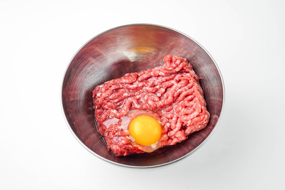 Выложить фарш в глубокую миску. Разбить яйцо прямо в фарш. Перемешать массу руками или ложкой до однородности, стараясь не переусердствовать, чтобы фарш не стал слишком плотным.
