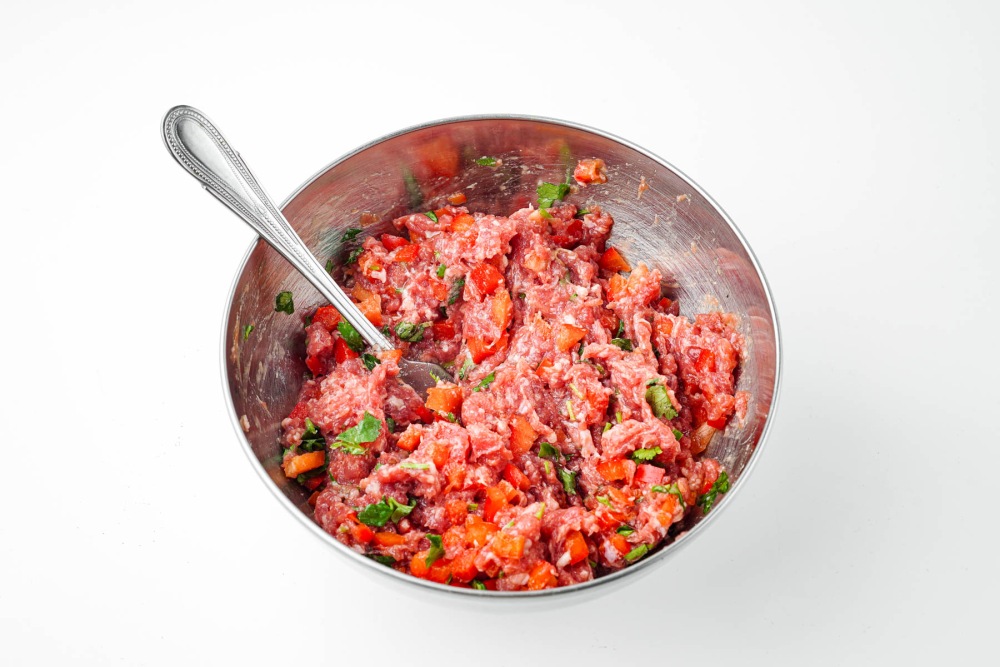 Всыпать нарезанный перец и рубленую кинзу в миску с фаршем. Перемешать всё тщательно, распределяя овощи по всей массе. Следить за тем, чтобы кусочки перца не сбивались в одном месте.