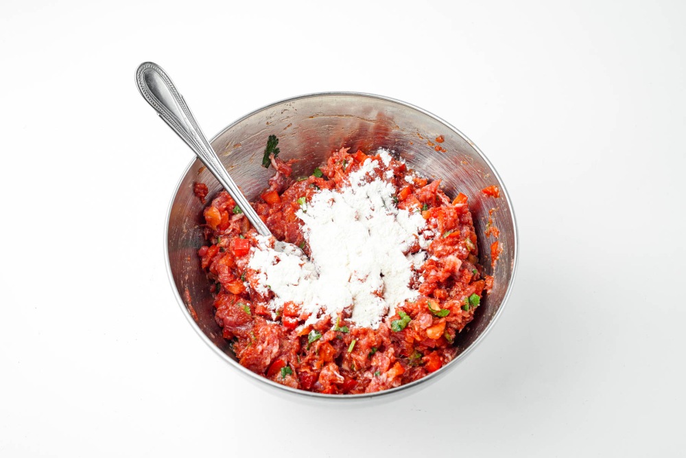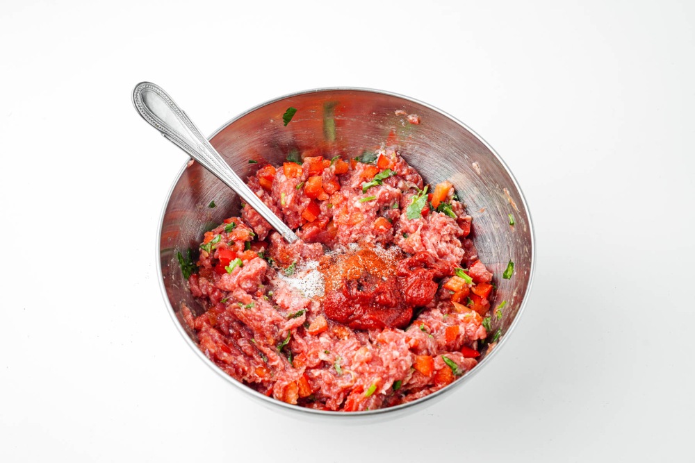 Выложить томатную пасту в фарш. Добавить соль, чёрный перец и копчёную паприку по вкусу. Перемешать массу до равномерного цвета и текстуры.