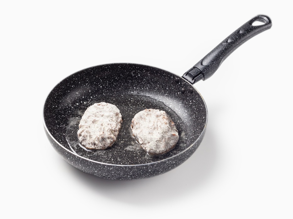 - Жарьте на среднем огне 3 минуты с каждой стороны, переворачивайте лопаткой осторожно – котлеты нежные.