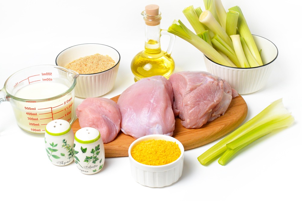 Подготовить ингредиенты: филе индейки, лук, панировочные сухари, сельдерей, соль и перец, молоко, а также масло для жарки.