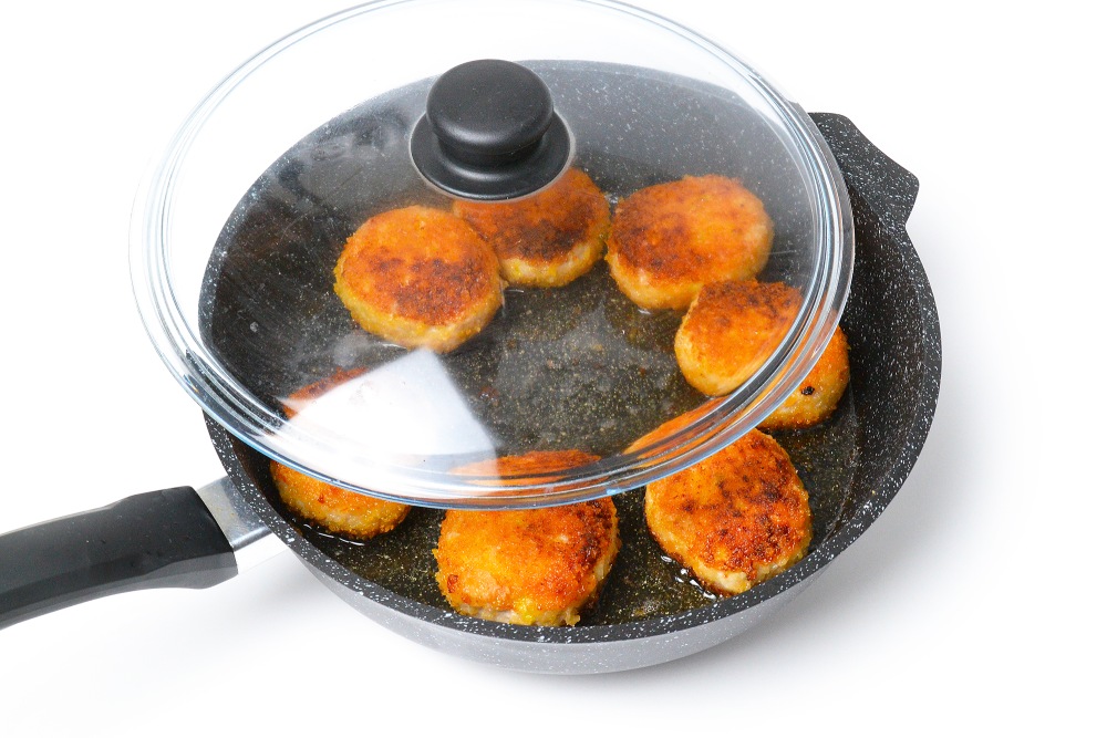 Нагрев уменьшить (4/6 для электроплиты), выложить котлеты и жарить 5-6 минут до золотистой корочки.