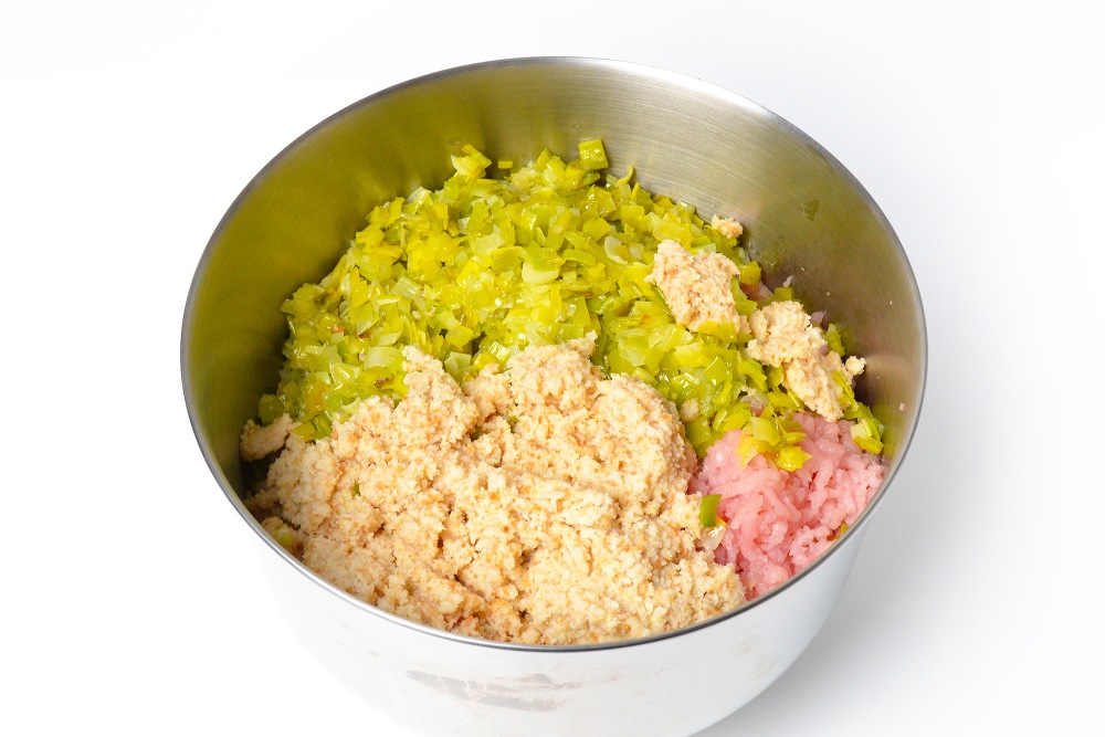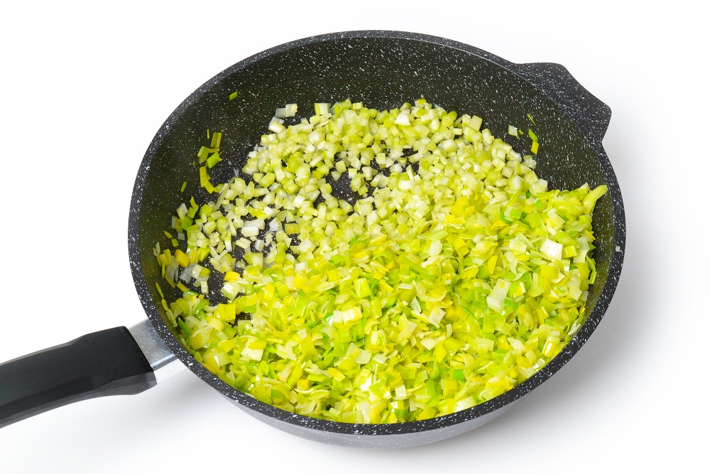 Разогреть растительное масло и обжарить лук-порей на сильном огне 2-3 минуты. Следом добавить сельдерей и жарить до мягкости, часто помешивая, чтобы ничего не пригорало. Обычно на это уходит 5-7 минут. Остудить до еле теплого состояния.