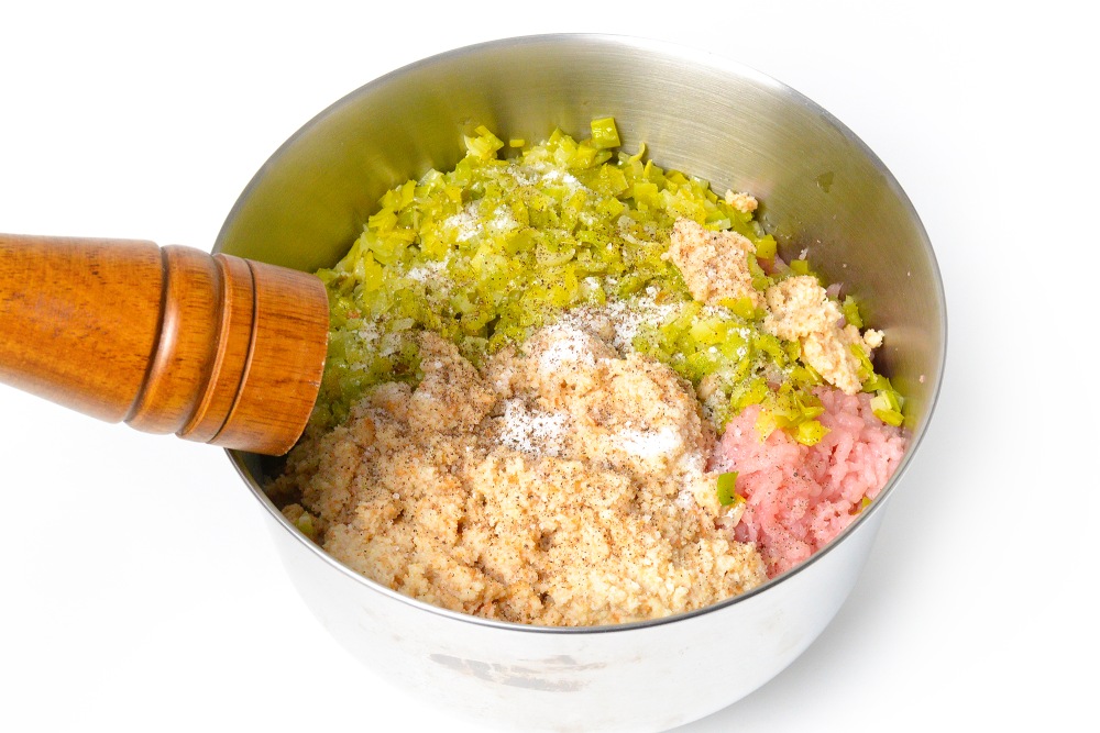 - Добавьте в фарш специи по вкусу: универсальную приправу, «Для птицы» или смесь ароматных трав по желанию.