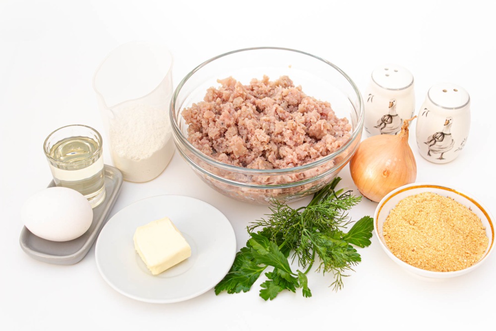 Подготовить необходимые ингредиенты для котлет из щуки на сковороде без сала. Щуку, яйцо, мука, панировочные сухари, сливочное и растительное масло, соль и специи по вкусу.