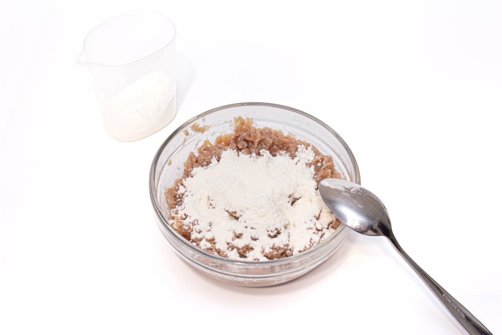 Добавить муку (2 ст.ложки). Хорошо размешать и оставить на 15 минут, чтобы мука впитала лишнюю влагу и набухла.