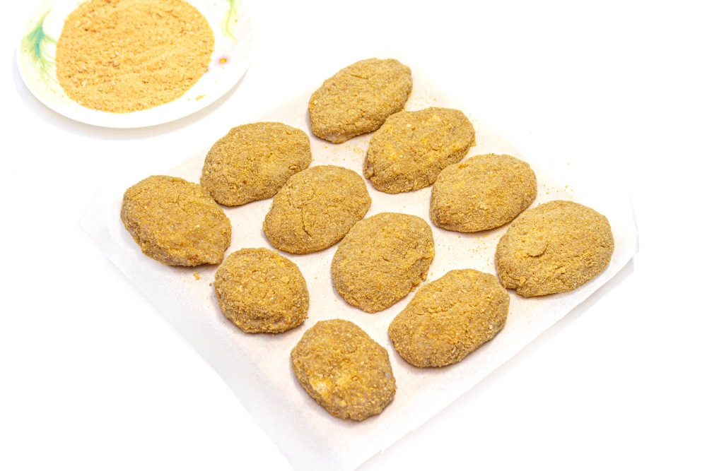 Руки тщательно вымыть с мылом и немного обсушить бумажным полотенцем. Сформировать котлетки влажными руками и обвалять в панировочных сухарях.