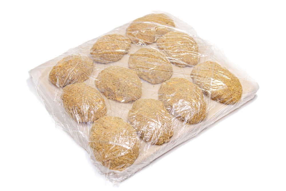Доску с выложенными котлетами обмотать пищевой пленкой/накрыть пакетом и убрать в морозилку на минут 20. Это нужно для того, чтобы форма котлет закрепилась и так легче будет обжаривать.