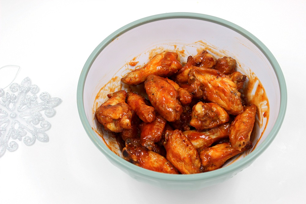 Смешать крылышки с острым, горячим соусом.