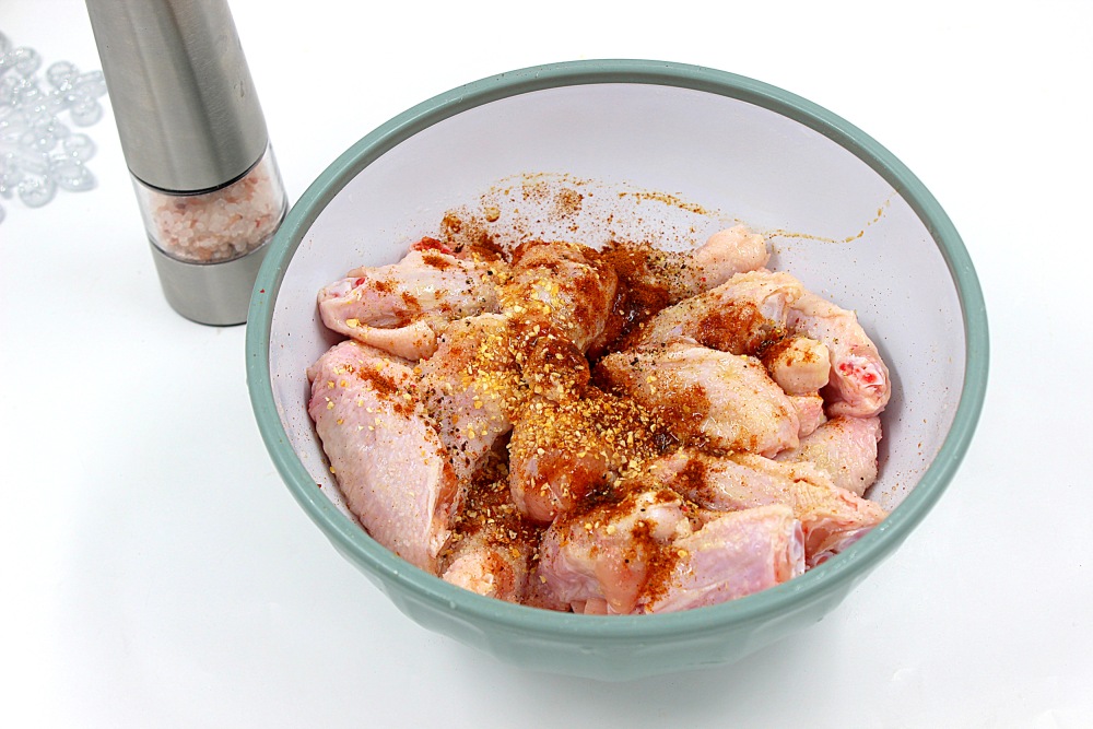К крыльям добавить соль, паприку, чесночный порошок, смесь перцев, ложку масла.