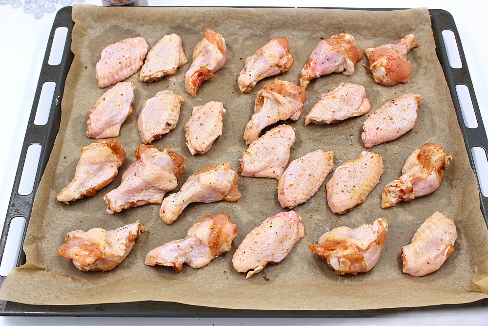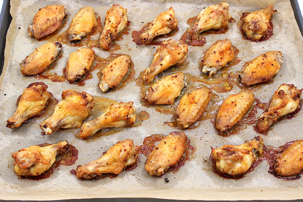 Разложить крылышки на противне и поставить запекаться в разогретую до 180 градусов духовку, примерно на 30-35 минут.