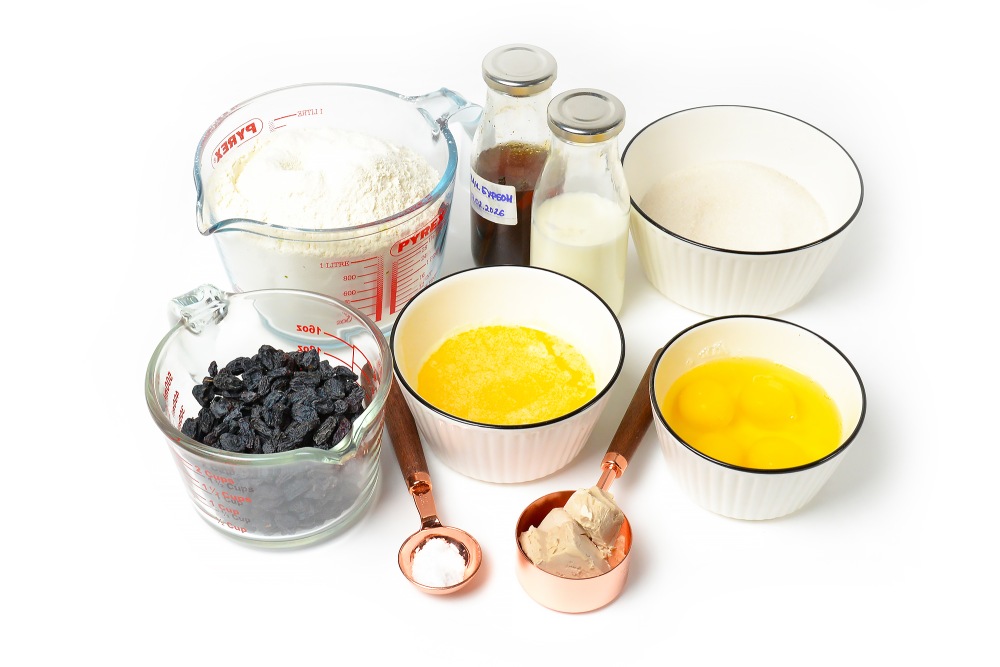 Подготовить ингредиенты: муку, дрожжи, сливочное масло, молоко, сахар и яйца, а также 1 желток, пару ложек ванильной эссенции, соль и изюм для начинки. Для глазури можно использовать айсинг, разведенный водой. Масло растопить немного заранее, чтобы остыло.