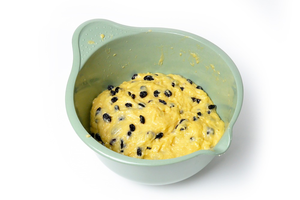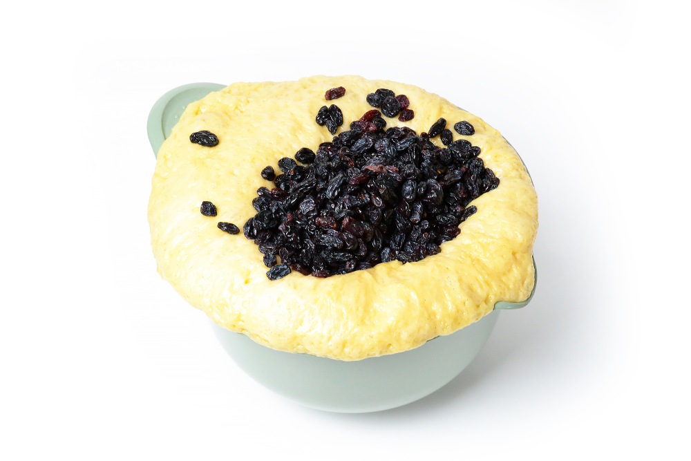 Добавить изюм в тесто и вмешать рукой.
