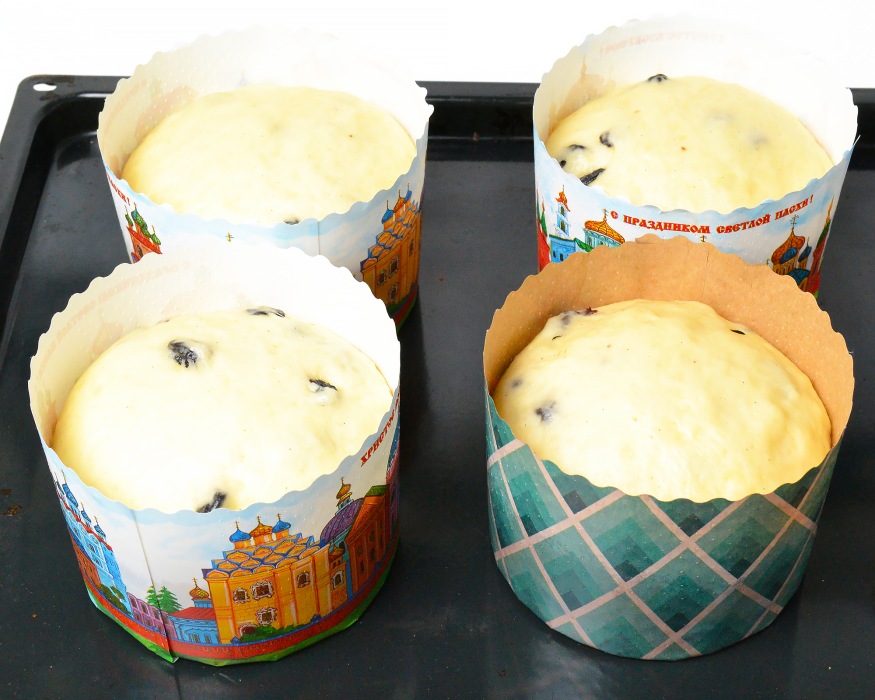 Накрыть куличи полотенцем и оставить подниматься еще на 20-30 минут. За 10-15 минут до выпечки духовку разогреть до 170-180 градусов. Куличи должны хорошо подняться, до края останется всего 1,5-2 см.