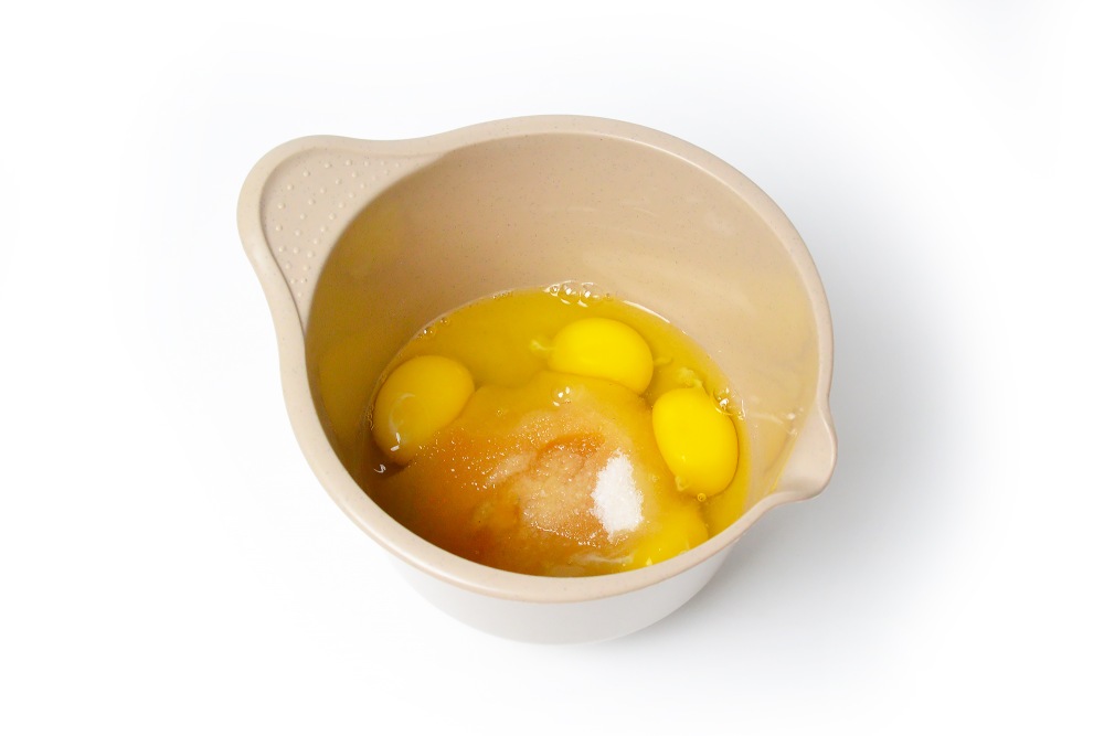 В отдельной миске взбить яйца с сахаром, солью и ванильным экстрактом. Сюда же добавить мед или алкоголь.