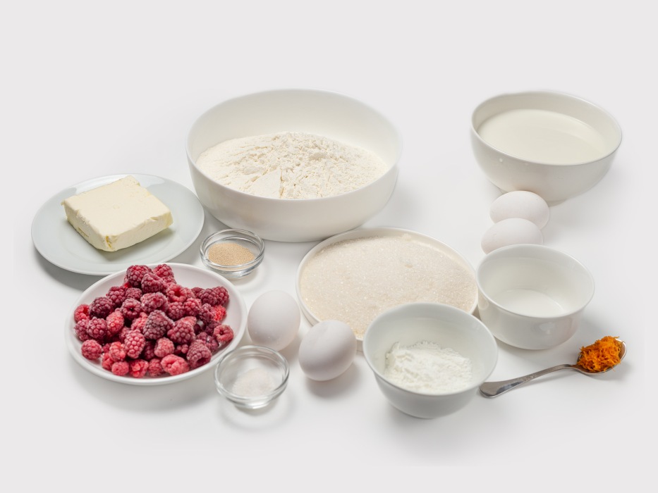 - Сахар – 220 г тесто 120 г + крем 50 + малина 50 г