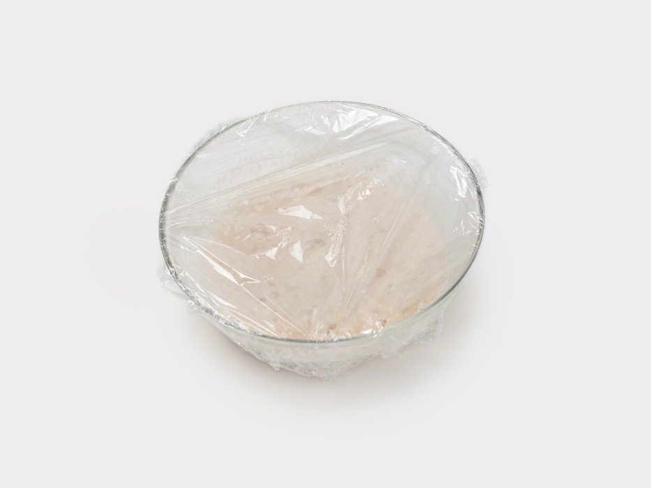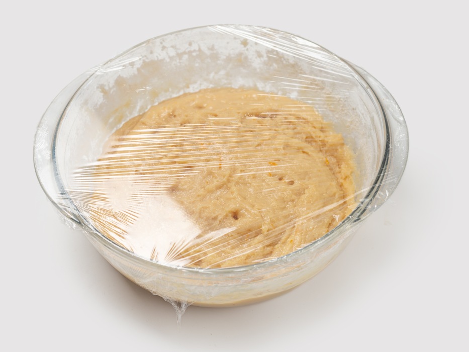 Накрыть тесто пищевой пленкой и поставить в теплое место подниматься на 4 часа.
