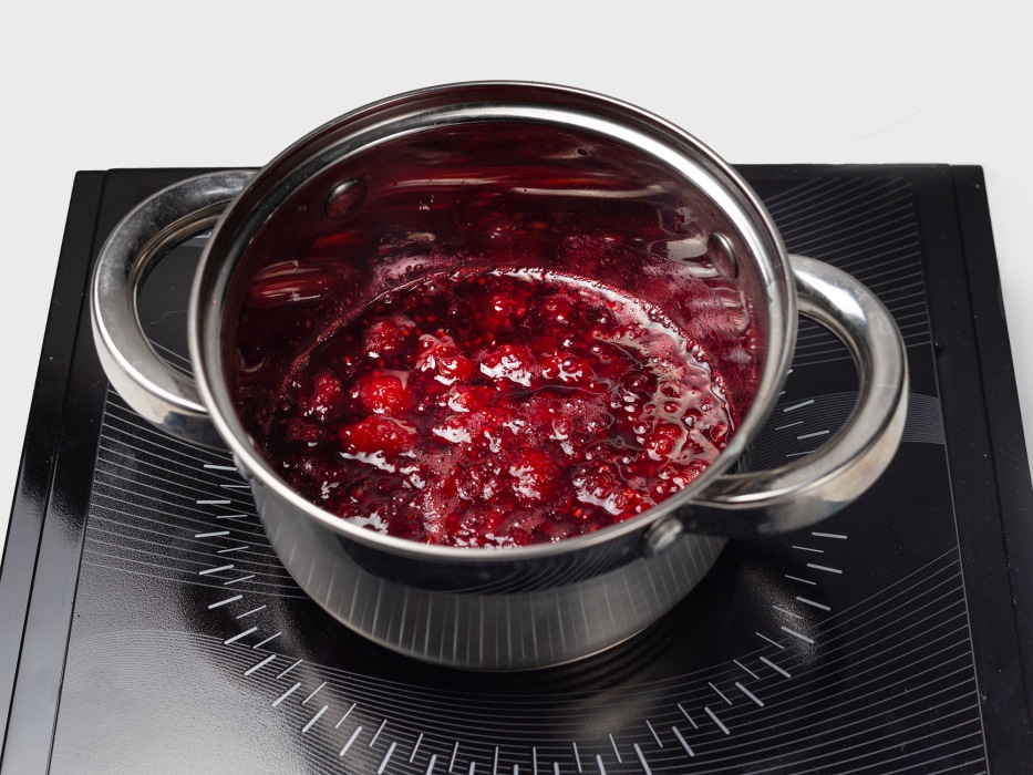 В кастрюлю выложить малину с сахаром и на медленном огне довести до кипения.