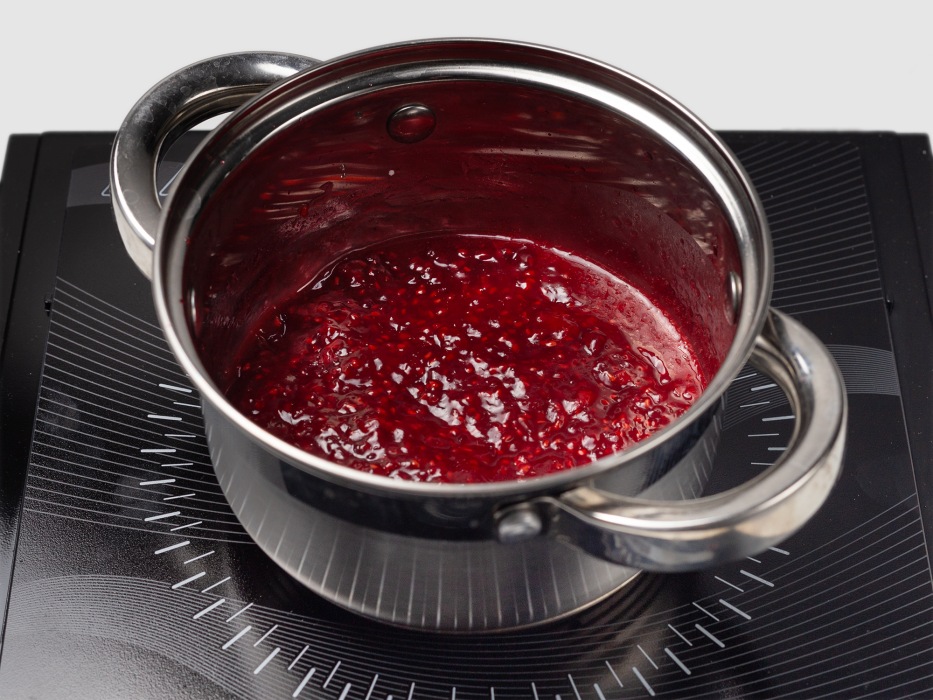 Влить растворенный крахмал в кастрюлю с малиной, хорошо перемешать.