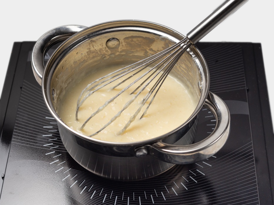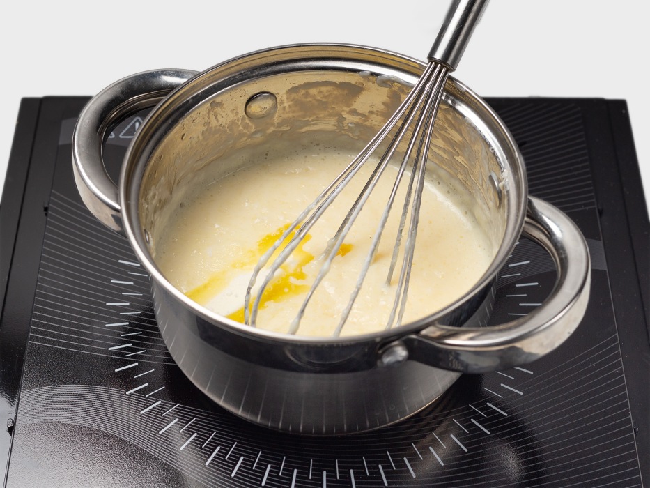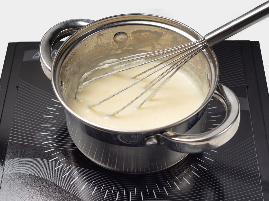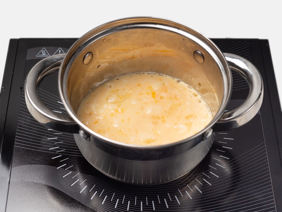 - Грейте молоко с крахмалом на минимальном огне, помешивая венчиком, чтобы не свернулось; вводите желтки тонкой струйкой при 80–85°C.