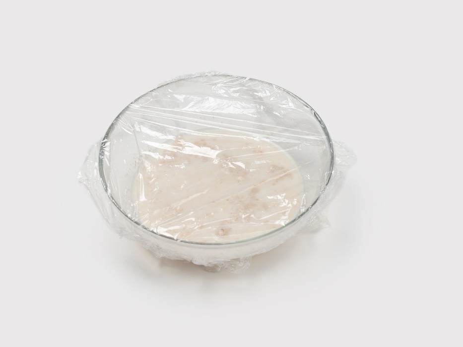 Накрыть дрожжи пищевой пленкой и оставить в теплое место подниматься на 15 минут.