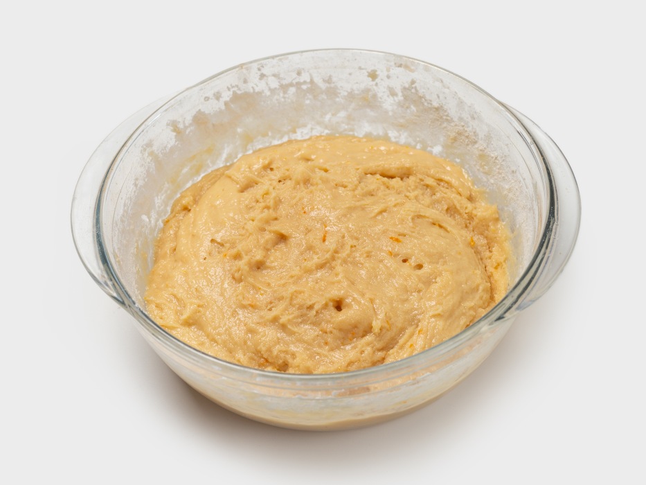 Добавить к взбитым яйцам с сахаром опару, цедру апельсина, растопленное сливочное масло и все хорошо перемешать венчиком движениями вниз-вверх.