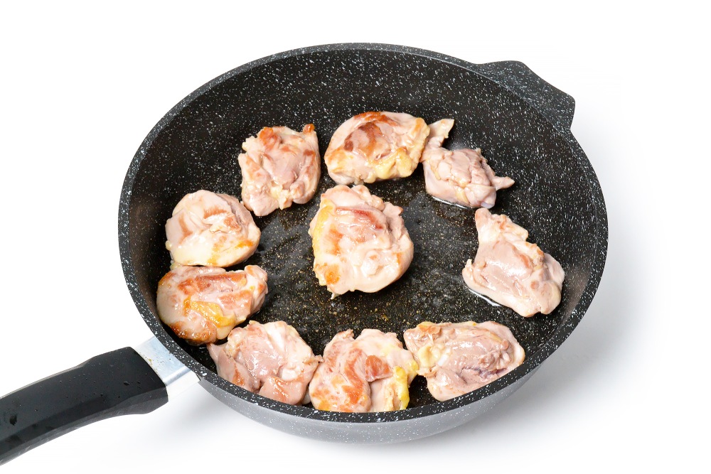 Разогреть масло, обжарить курицу 3-4 минуты с одной стороны.