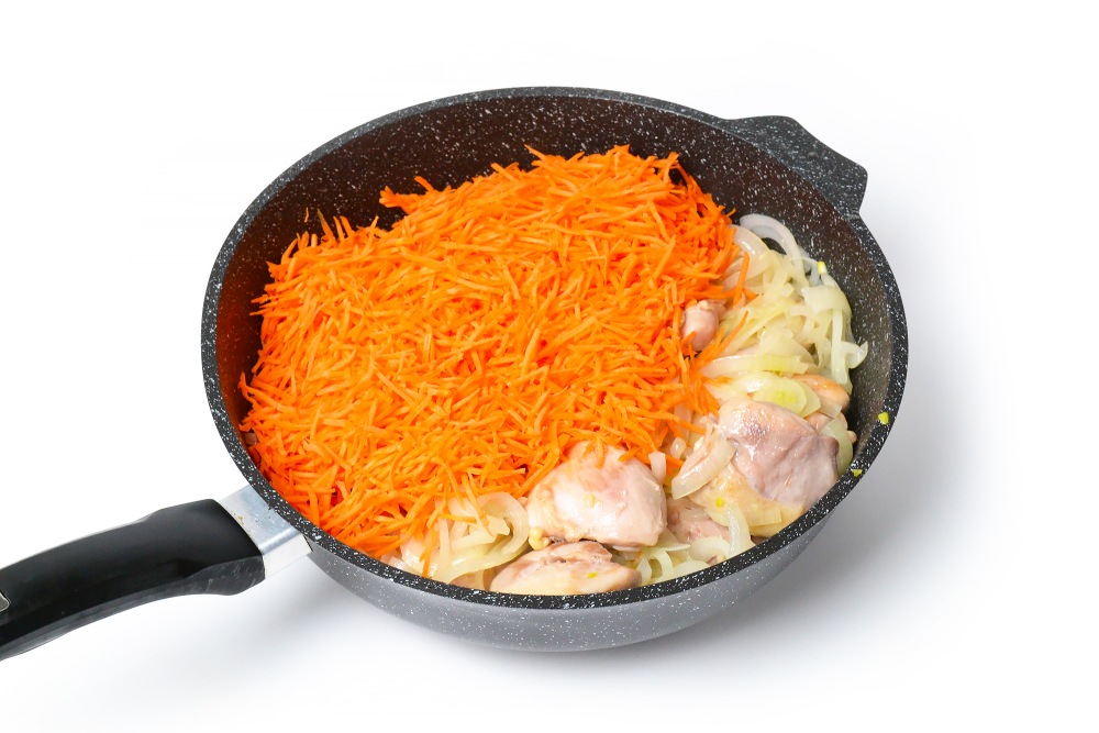 Добавить к курице и луку морковь, перемешать и обжарить все вместе еще 5-6 минут. Морковь должна уменьшиться в объеме.
