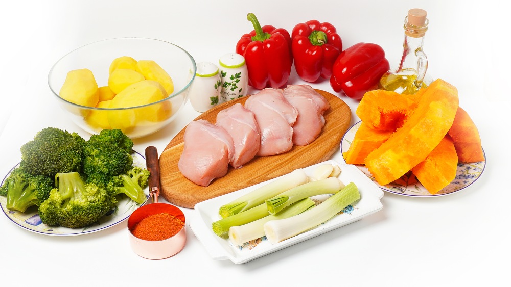 Подготовить ингредиенты: курицу, тыкву, картофель, брокколи, сладкий перец, лук, оливковое масло, молотую паприку, чеснок, соль и перец.