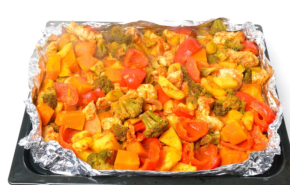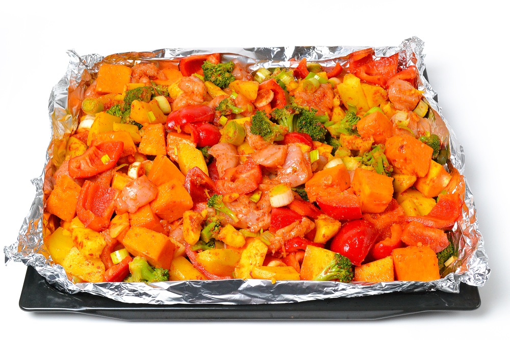 Тщательно перемешать и выложить на противень, застеленный плотной фольгой. Края можно слегка подогнуть кверху, чтобы овощи не вываливались. Также можно использовать более глубокий противень.