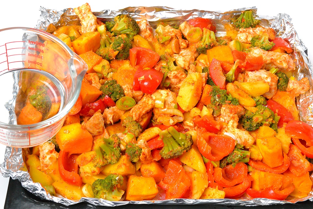 Отправить назад в духовку и запекать еще 20-40 минут. У меня ушло 1 час и 20 минут на все время запекания. Готовность можно проверить ножом, проткнув картофель, тыкву и брокколи. Они должны хорошо держать форму, но легко протыкаться.