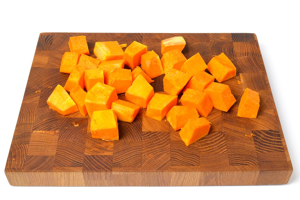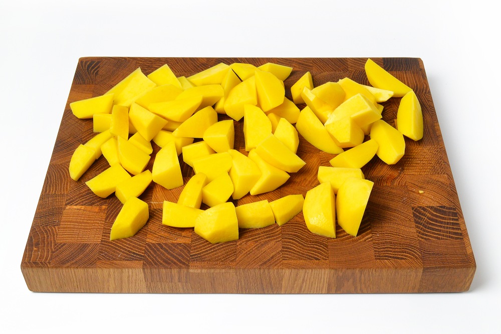Пока картофель варится, похожими кусочками нарезать тыкву. На этом же этапе можно включить духовку на 230 градусов.