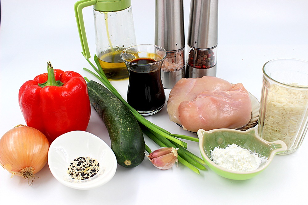 Подготовить все ингредиенты для курицы терияки с рисом и овощами.