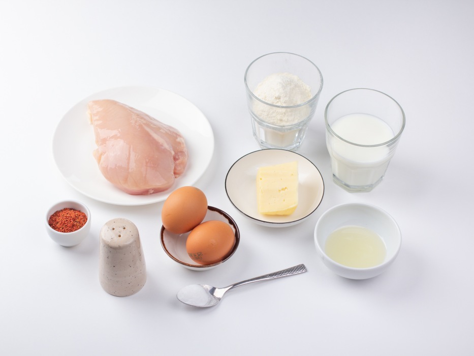 Подготовить все ингредиенты для запеканки с куриным филе. Отмерьте нужно количество муки, молока и сыра. Заранее отварить куриное филе. Подготовьте форму для запекания. Лучше всего использовать стеклянную, керамическую или металлическую, размером примерно 18–20 см.