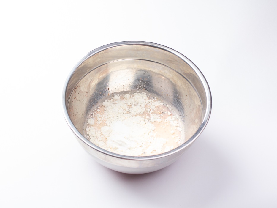 В миску к жидким ингредиентам добавить просеянную муку и соду.