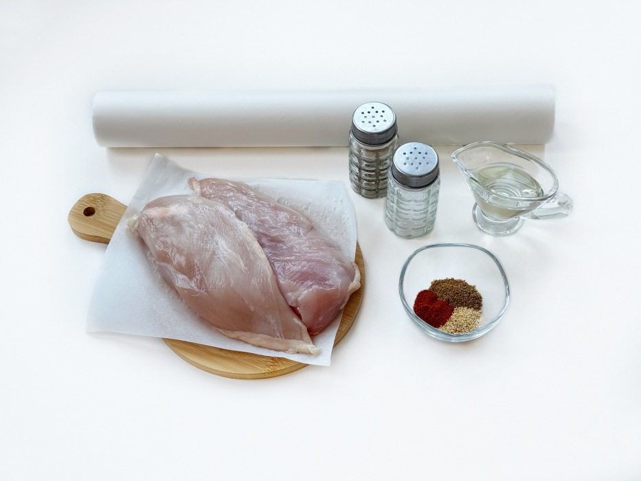 Подготовить ингредиенты для приготовления куриного филе в пергаменте на сковороде. Для рецепта выбирать охлажденное куриное филе, любимые специи и масло без запаха.