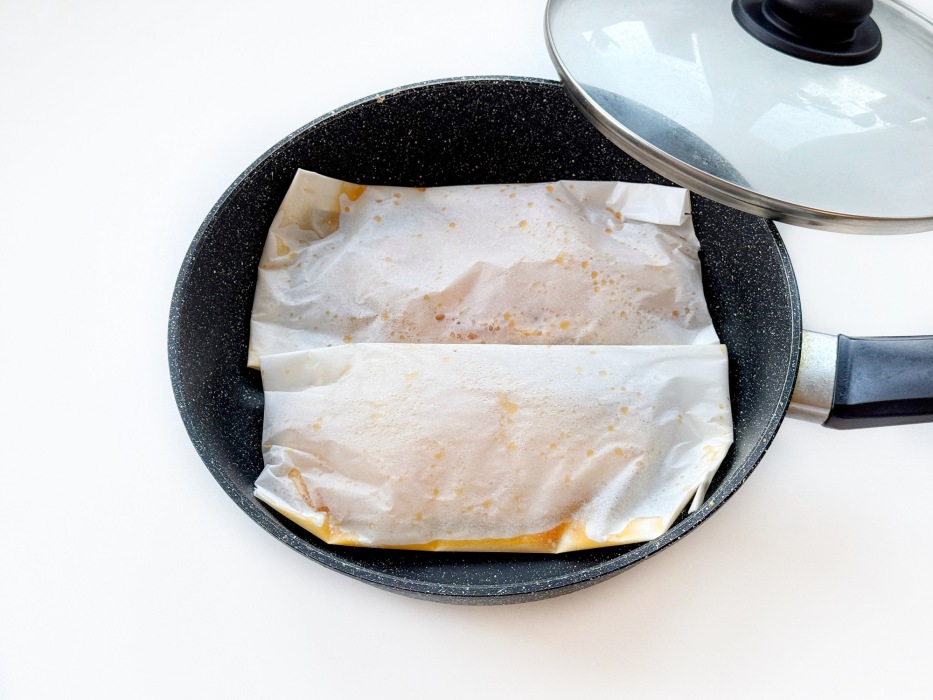 Выложить конверты с филе на сухую сковороду рядом друг с другом.