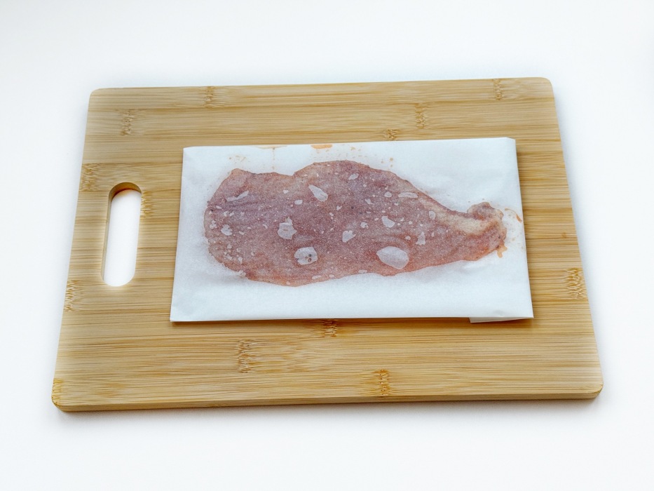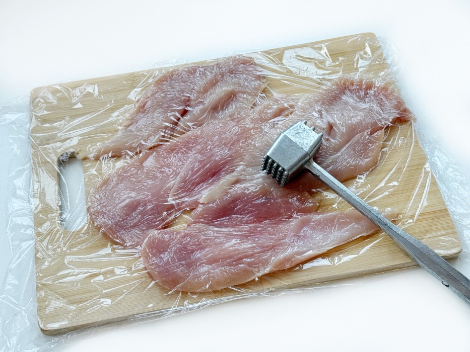 Разложить получившиеся куски на доске, накрыть пищевой пленкой и аккуратно отбить кухонным молотком.